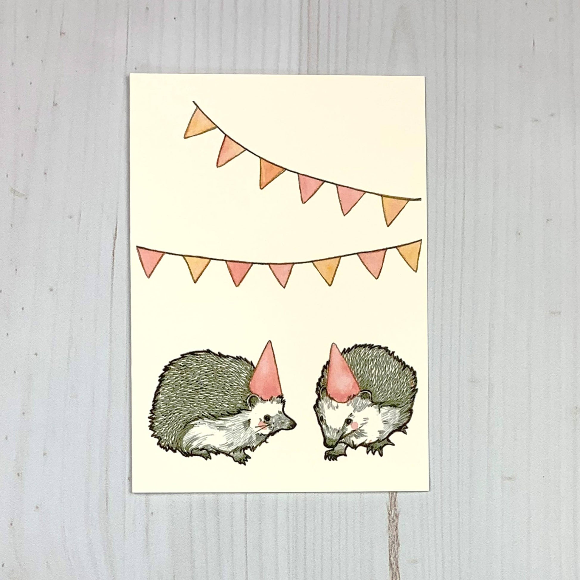 This listing is for a 5x7" notecard printed with a watercolor and graphite hedgehog party illustration.