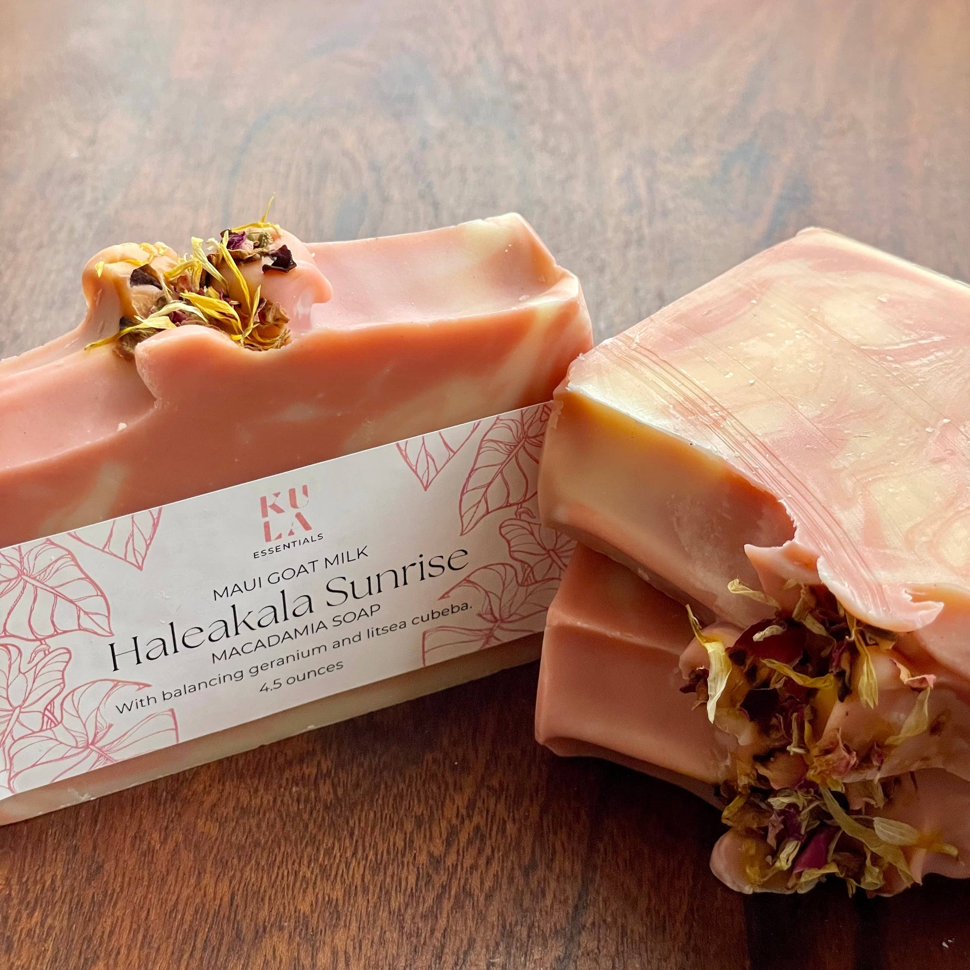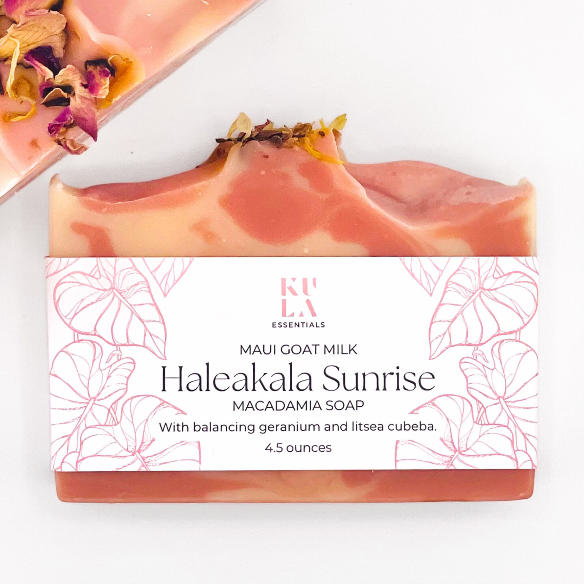 Color: Peachy pink swirl from purifying rose kaolin clay inspired by the stunning sunrise at the summit of Haleakala volcano on Maui. Topped with beautiful rose and calendula petals.