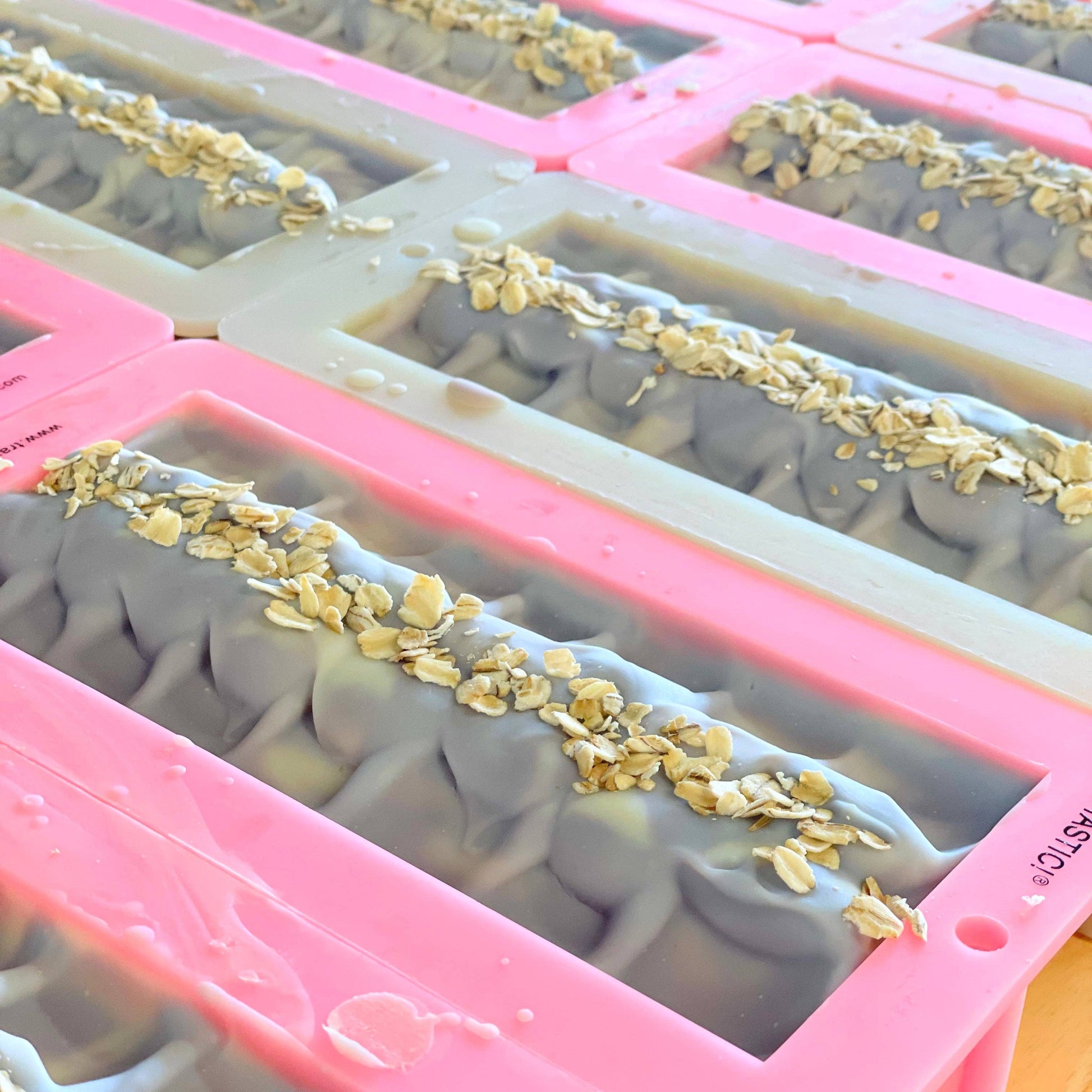 Color: Cream with a lavender swirl from an infusion of soothing Alkanet root. Topped with gentle oats.