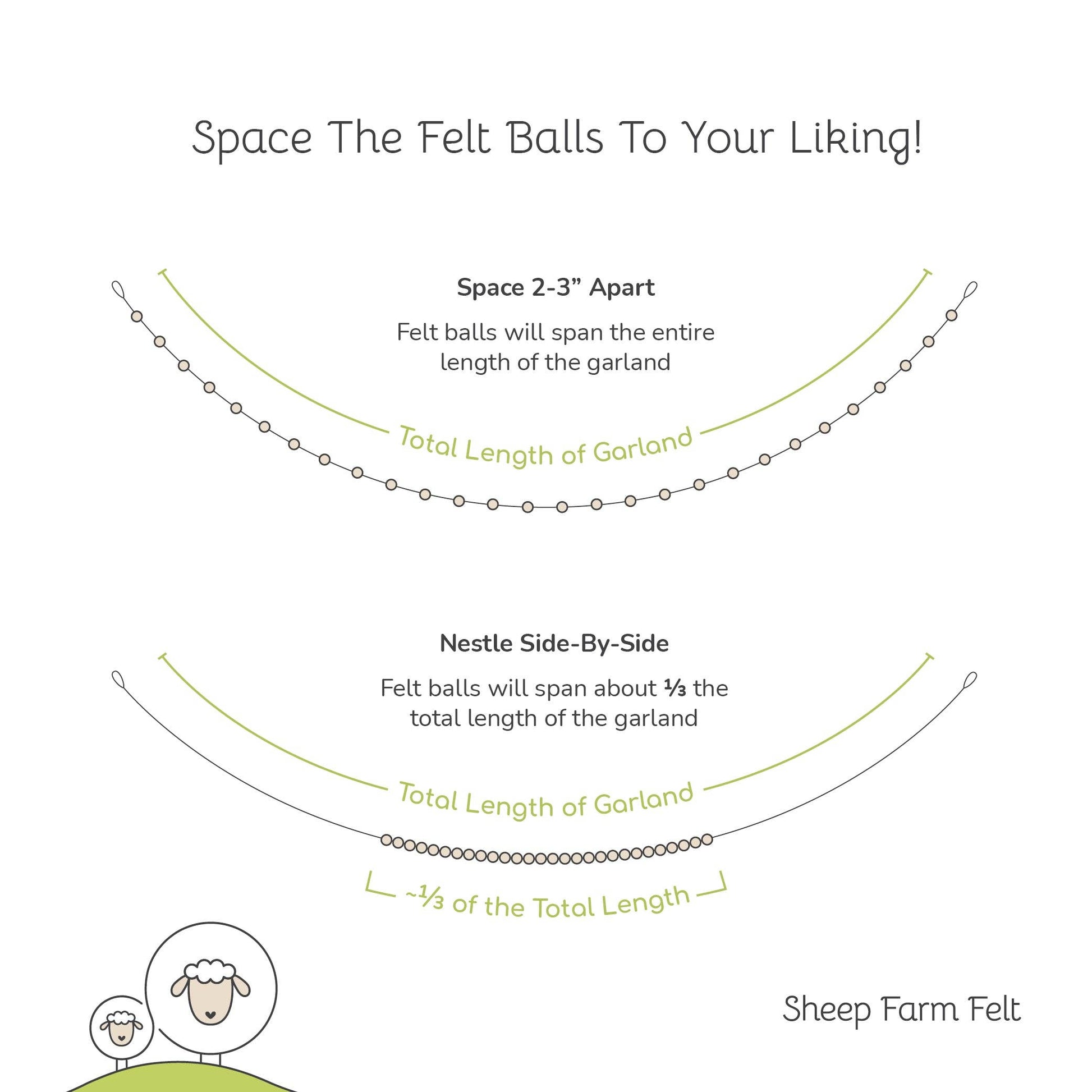 * Nestled side-by-side, felt balls will span about 1/3 the total length of the garland