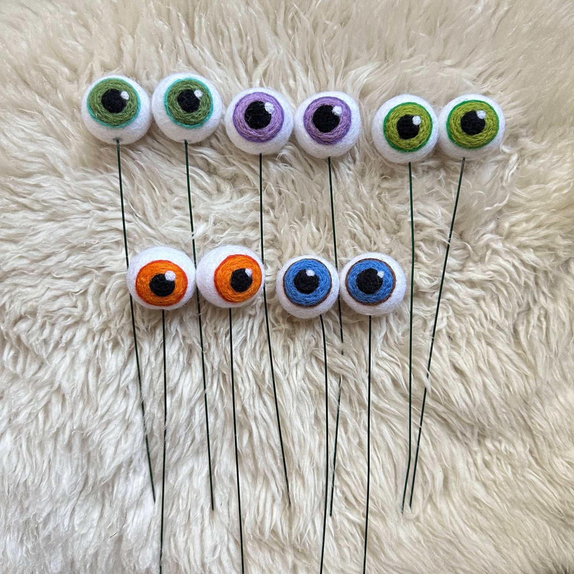 These eyeballs come in a selection of 5 colors. Each hand-felted wool eyeball is securely fastened to a 9 inch long rust-proof floral wire.