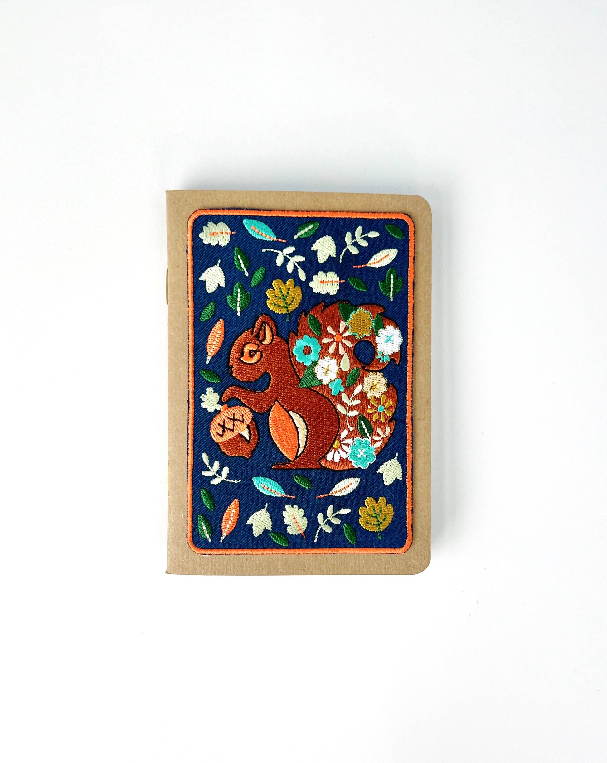 Adorable Squirrel with leaves and flowers embroidered pocket notebook. Embroidered appliqué on kraft paper 3.5X5 inch 32 page blank sheet journal. Perfect for tucking in your bag or pocket. Blank high quality paper allows you to write or sketch. Rikrack logo stamped on back.