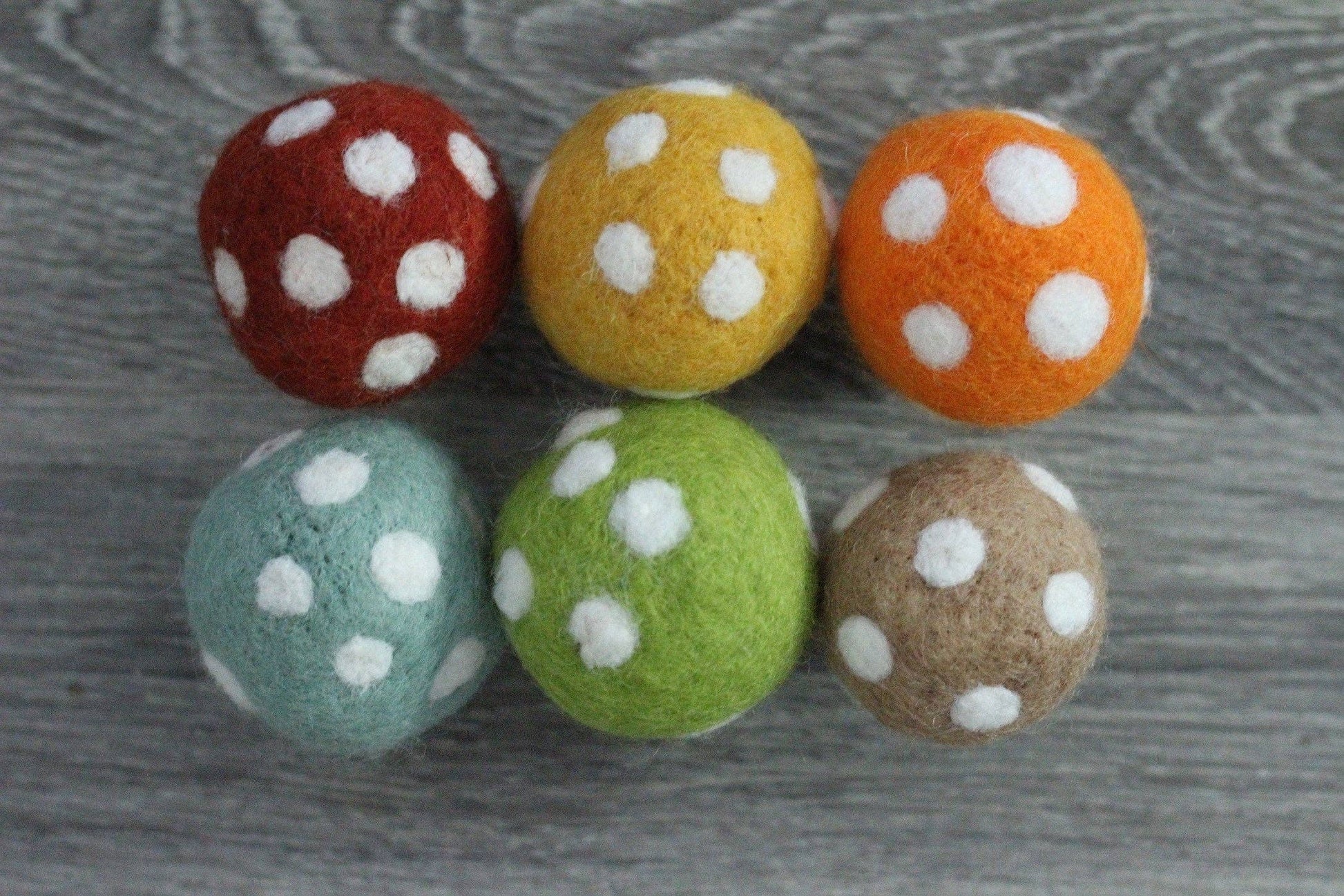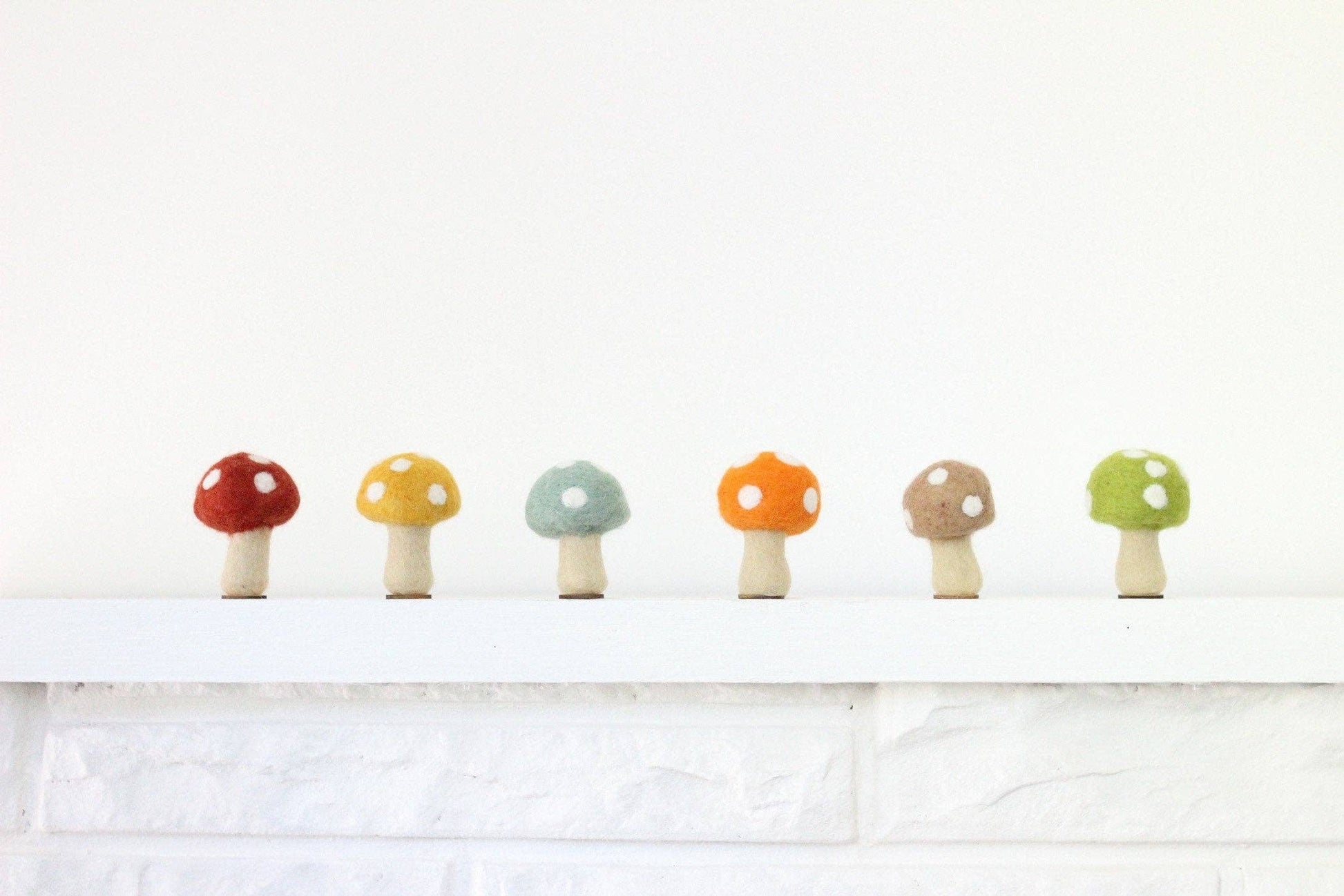 woodland colored felted mushrooms Stands 3.25 inches high 3 inches wide wooden base